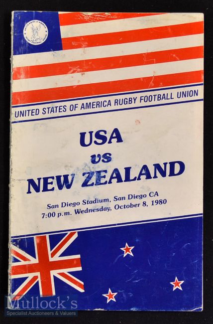 Very Rare 1980 USA v New Zealand All Blacks Rugby Programme: 36pp issue with slightly colour-run flag-design cover and big build-up for this San Diego Test billed as the first ever official meeting of these national sides.