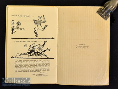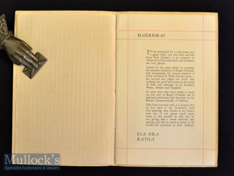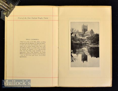 Scarce 1935 All Blacks Dinner Menu after Somerset/Glos at Bristol: Lavish semi-stiff covered 24pp ‘travelogue’ style issue welcoming the All Blacks and showing off with tipped-in photographs the many architectural treasures of the two counties^ plus menu^ toast list^ welcome and cartoon. Some dust rubbing to light covers but o/wise VG. Special effort^ desirable