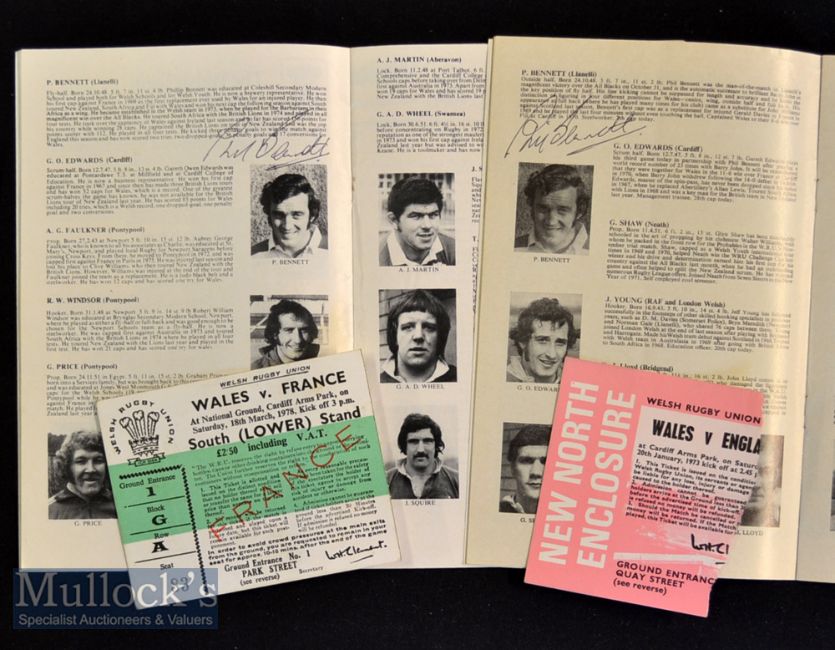 1973-8 Phil Bennett Signed Rugby Programmes/Tickets (2): Lovely pair^ 25-3 home win over England 1973 & his last cap v France^ Grand Slam clincher v France 1978^ both w/tickets. Nice memorabilia of a great No.10. VG