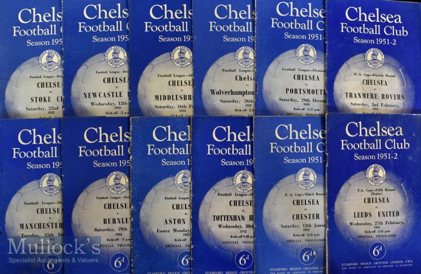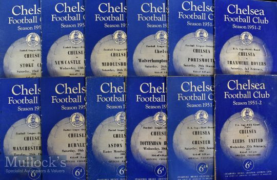 1951/52 Chelsea home football programmes including Manchester City^ Portsmouth^ Wolverhampton Wanderers^ Middlesbrough (no staples)^ Newcastle United^ Stoke City^ Aston Villa (no staples)^ Burnley^ Tottenham Hotspur (no Staples)^ Chester FAC^ Tranmere Rovers FAC^ Leeds United FAC^ minor faults throughout^ folds^ creases^ A/G condition overall (12)