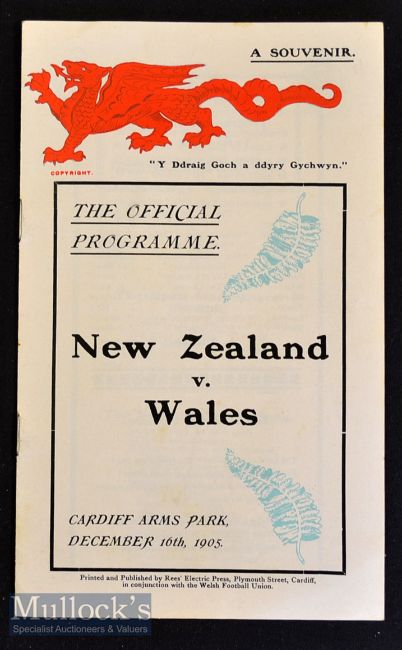 1905 Wales v New Zealand ‘official’ Rugby Programme reprint: The 1981 reproduction of the original ‘Holy Grail’ programme from Wales’ 3-0 defeat of the Original All Blacks. Clean^ sharp^ immaculate and increasingly sought-after. Near mint