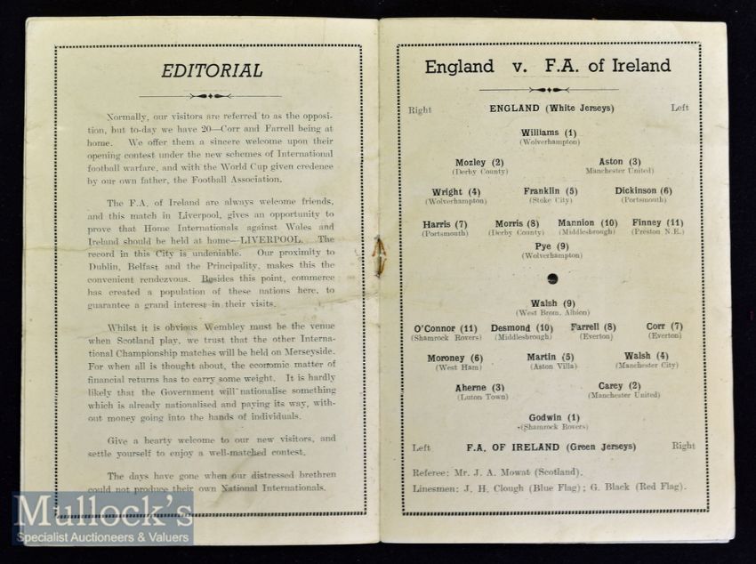 1949 England v FA of Ireland International football programme date 21 Sept at Goodison Park^ light creasing throughout^ light folds^ o/w in good overall condition^ England’s first defeat to a non-UK national team.