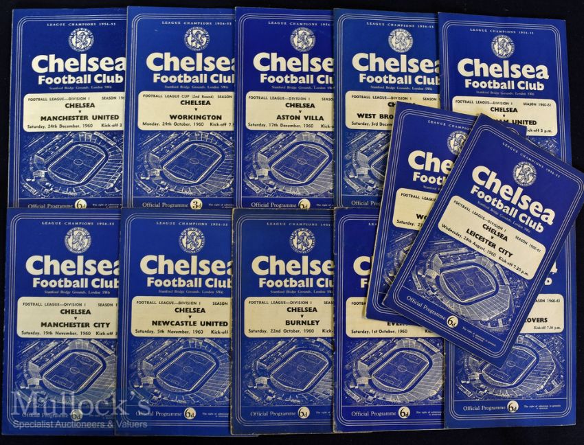 1960/61 Chelsea home football programmes to include Leicester City^ Wolverhampton Wanderers^ Blackburn Rovers^ West Ham United^ Everton^ Burnley^ Newcastle United^ Manchester City^ West Bromwich Albion^ Aston Villa^ Manchester United and Workington FLC (single sheet)^ light creasing^ folds^ scores to few^ o/w in generally good condition overall (12)