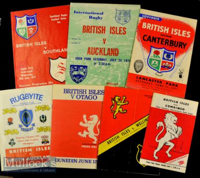 1971 British & Irish Lions in NZ Rugby Programmes (7): Grand group of provincial games from the triumphant tour^ very good issues in a variety of formats from the clashes at Wellington^ Combined Canterbury/N Otago)^ Otago^ Canterbury (bloodbath)^ Southland (scarce)^ Auckland & N Auckland. Lovely selection