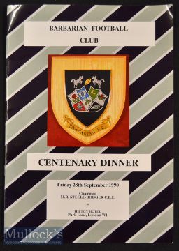 1990 Barbarians Centenary Dinner Menu: The ‘second edition’ of this famous brochure^ re-issued with pics and a host of facsimile autographs of the hundreds of famous members present at the historic London Hilton celebration. Very collectable and excellent condition