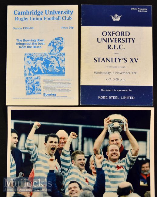 1980s/90s Varsity Rugby: a selection (3): Programmes from Cambridge v Steele-Bodger’s XV 1988 (inc Dominguez^ Skinner and Mike Hall etc) and from Oxford v Stanley’s XV 1991 (inc D Kirk^ S Barnes^ and Richard^ son of Alun Pask etc); plus a fine colour photo of the celebrating Cambridge side after their 1994 Varsity Match win. G/VG