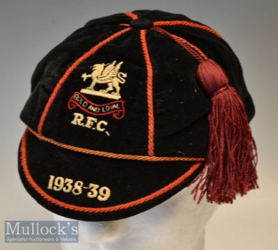 1938-9 Wycliffe College Rugby Honours cap: Lovely example from just before WW2 of a cap awarded at the Gloucestershire public school to T Leddra. Black velvet panels with red braid and maroon tassel^ all in as new condition. Great!