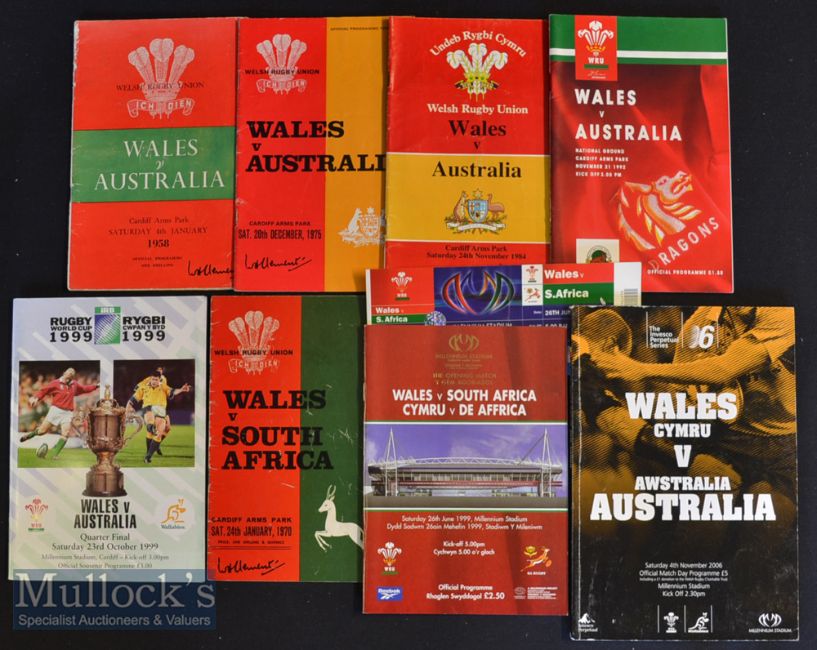 Wales v Australia & v S Africa Rugby Programmes (8): Issues v the Wallabies in 1958^ 1975^ 1984^ 1992^ 1999 (RWC Quarter Final) & 2006; and v South Africa 1970 (Wales’ first draw v the Springboks) and 1999 c/w ticket (First Welsh win over them^ in 1st game at the then-Millennium Stadium!). G/VG condition