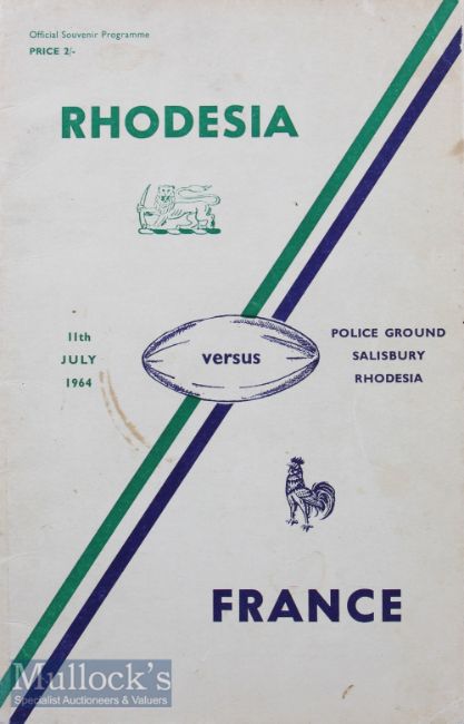 Rare 1964 Rhodesia v France Rugby Programme:  Stiff-covered 44pp issue^ hard to locate^ rarity more than compensating for slight mark to front cover and large old glue marks and a little residue of album page to the rear cover. Internally^ the autographs of many of the players have been collected on paper and individually stuck near the relevant pen-picture. O/wise generally good