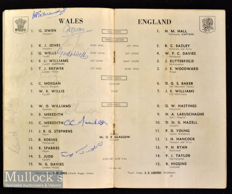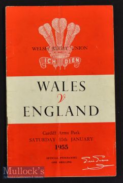 1955 Autographed Wales v England rugby programme: Usual Arms Park magazine issue with some folds but autographed in pencil and in pen to Welsh team page by 12 of the side and reserves including Bleddyn Williams^ Ken Jones^ Bryn Meredith^ Rex Willis etc. Good