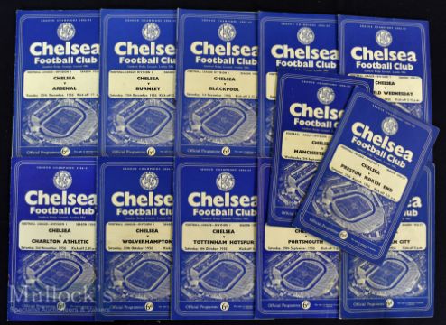 1956/57 Chelsea home football programmes including Preston North End^ Manchester United^ Birmingham City^ Sheffield Wednesday^ Portsmouth^ Tottenham Hotspur^ Wolverhampton^ Charlton Athletic^ Luton Town^ Blackpool^ Burnley and Arsenal^ light staple rust^ folds to some^ generally clean examples (12)