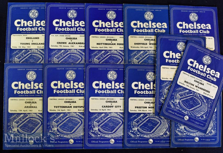 1960/61 Chelsea home football programmes including Bolton Wanderers^ Fulham^ Blackpool^ Birmingham City^ Preston North End^ Cardiff City^ Tottenham Hotspur^ Arsenal^ Sheffield Wednesday^ Nottingham Forest^ Crewe Alexandra FAC^ also England v Young England 61 (single sheet)^ light creasing^ folds etc^ generally good examples overall (12)