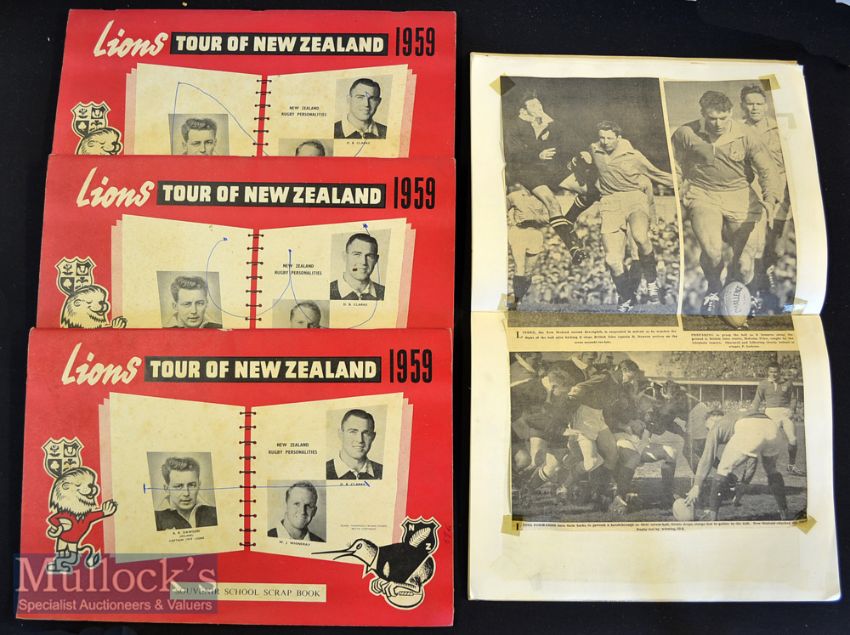 1959 British & Irish Lions in NZ Rugby Scrapbooks (4): Trio with specially-designed Lions pictorial red black and white covers^ religiously completed with cuttings and pictures and tagged 1^ 2 & 3. Also another^ standard scrapbook^ similarly filled and tagged ‘3rd & 4th Tests’. Lovely scarce memories 60 years on^ generally G