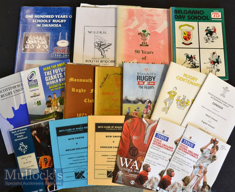 Schools & Youth Rugby Collection (18): Lovely wide selection to incl 50 Years of Welsh Youth Brochure & Menu 1999; 100yrs Schools’ Rugby in Swansea^ 2000; Alan Evans’ folder of notes^ reports^ p/copies^ pic etc from the WSSRU Tour to S Africa 1956; Blundell’s School Rugby 150yrs 2018; Radley College Centenary 2104; Monmouth School Centenary 1973 plus team pic with author; Royal Belfast Academy Centenary1974; Belgrano Day School Argentina 75th Anniversary Tour to Europe 1988; Scottish Schools Tour to SA 1996 incl Princess Anne’s son Peter Phillips; Under 19 World Champs 2007 N Ireland; Menu Welsh Schools U-16 captained by and signed by Dan Biggar; plus 6 progs for age Group or Boys’ Clubs ‘Tests’ 200-2007 incl many to-be-big names. Generally G/VG