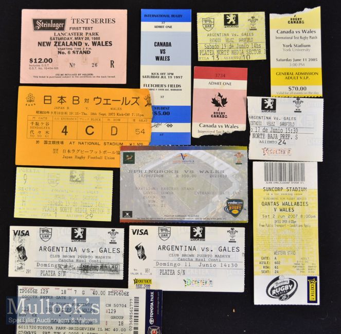 Scarce Wales Away Rugby Tickets (13): Between 1975 and 2009^ some whole^ some stubs^ tickets from Welsh games in Japan^ New Zealand^ Canada^ Argentina^ Australia^ South Africa and the USA^ several different tours covered to some countries. Mostly good^ a little fading on one or two^ nice lot