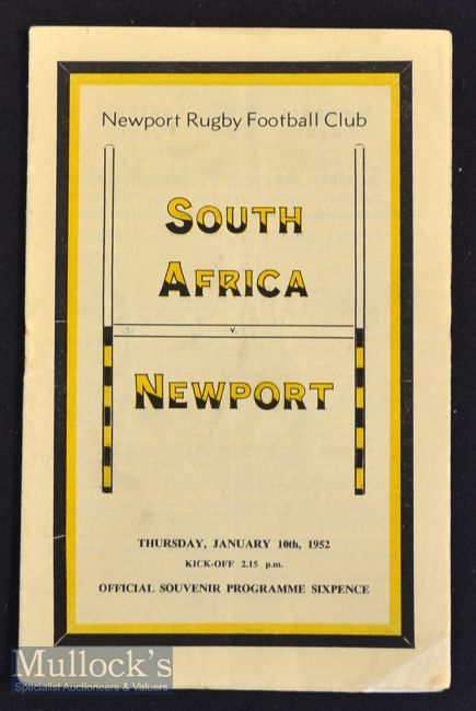 1952 Newport v S Africa Signed Rugby Programme: 12 pp attractive issue for the game won 12-6 by the Springboks^ signed to the team pages by stand-in centre RD ‘Bobby’ Owen. Very good condition