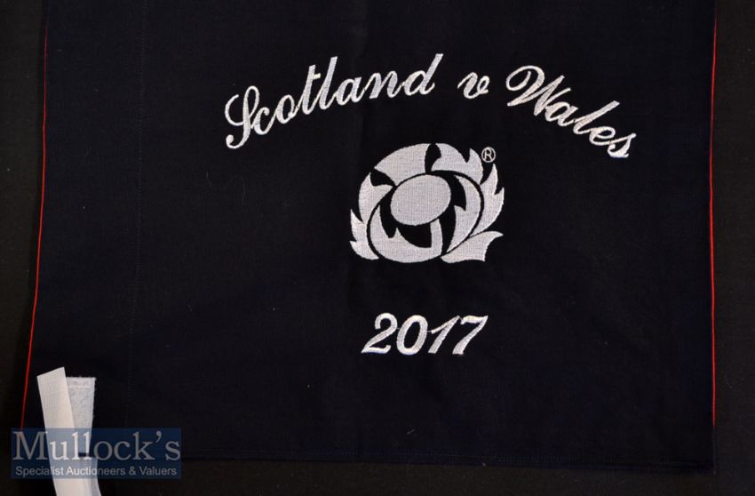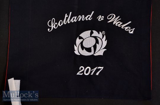 Rare Presidents’ Presentational International Touch Judge’s Flags (2): A pair of the colourful^ badged and dated flags only produced to be presented to the respective Rugby Unions’ presidents at Six Nations games. These are from Wales v England (Champions) and Scotland v Wales 2017^ and are the last offered^ exhausting the collection of Dennis Gethin^ Past WRU President^ who donated them for the benefit of the Welsh Rugby Charitable Trust. Excellent