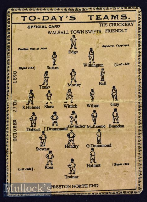 Rare and Interesting 1890/91 Walsall Town Swifts v Preston North End football programme a friendly match^ date 27 Oct^ single sheet^ centre fold^ minor signs of wear o/w in good condition overall. Preston were the first winners of the newly formed football league and also won the FA Cup that season being the first team to complete the double