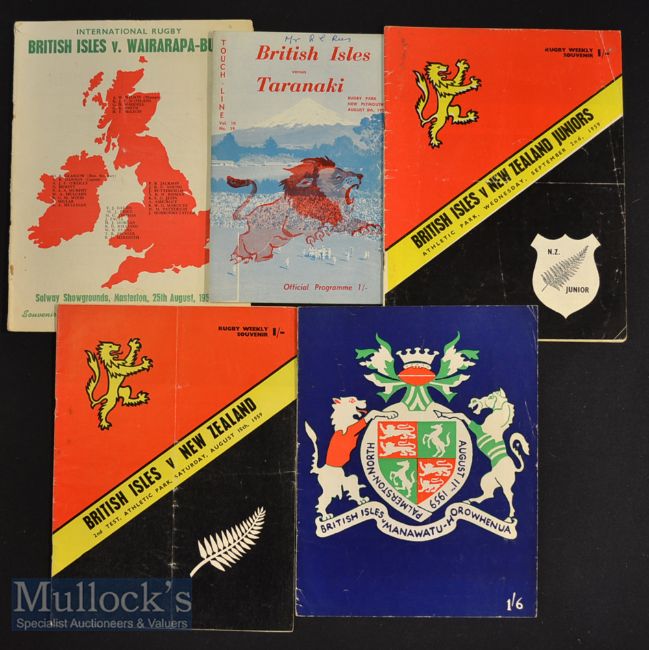 1959 British & Irish Lions in NZ Rugby Programmes (5): Five more editions from the 1959 trip^ the 2nd Test at Wellington^ lost 11-8^ plus games at Taranaki^ Manawatu-Horowhenua (v attractive cover)^ Wairarapa-Bush & NZ Juniors. Generally good^ just the odd mark or name.