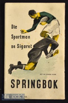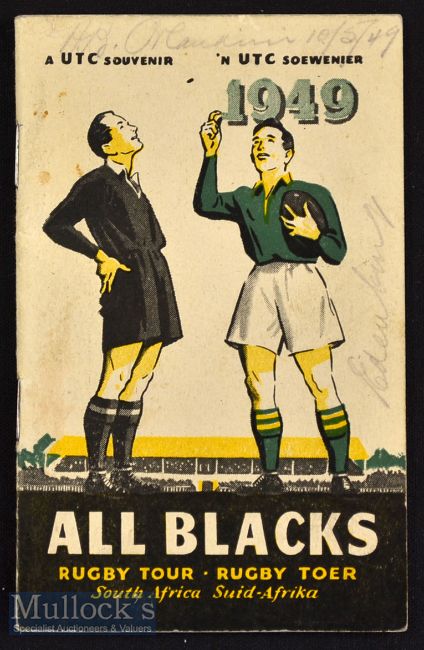 Scarce 1949 All Blacks SA Tour Souvenir Booklet: Neat compact colour-covered 40 small paged United Tobacco Company production for the All Blacks’ Second Trip to South Africa. Pencilled name lightly on cover. Lovely