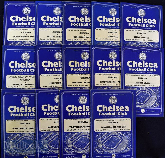 1958/59 Chelsea home football programmes including Tottenham Hotspur^ Wolverhampton Wanderers^ Newcastle United^ Aston Villa^ Nottingham Forest^ Bolton Wanderers^ Leicester City^ South Africans (friendly) (single sheet)^ Frem Copenhagen (Fairs Inter-Cities Cup) Leeds United^ Arsenal^ Birmingham City^ Manchester United and Blackburn Rovers^ light folds^ o/w generally in good condition (14)