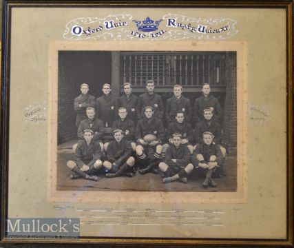 1910-11 Rare & Splendid Large Oxford University Photo: Original classic mounted Gillman of Oxford hand-decorated & fully-named Varsity Match team photograph^ subsequently and attractively framed & glazed^ some foxing as is usual and possibly even and additional feature of such material from over a century ago. Image size 14.5” x 11.5”^ overall 24” x 20”. Those 23-18^ record margin^ winners pictured include the legendary England star and noted WW1 casualty Ronnie Poulton-Palmer^ Wales’ Billy Geen and in keeping with the sad statistics of the time^ two others who were to die in action 1914-18. Lovely nostalgic item^ G for its age.