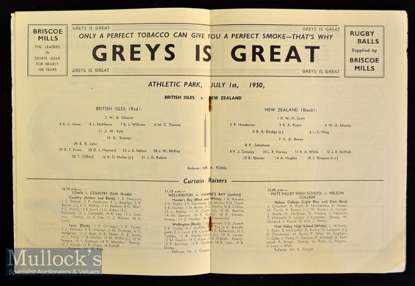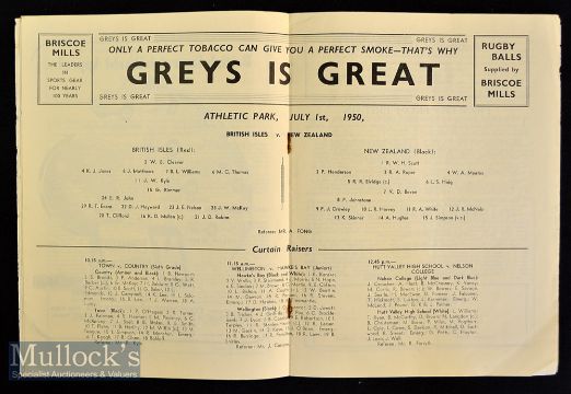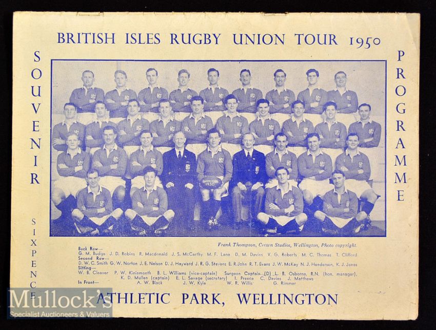 1950 Scarce British & Irish Lions to New Zealand Rugby 3rd Test Programme: The large issue from Wellington for the Test won 6-3 by the All Blacks^ team photograph of the Lions to the front cover. Clean^ G/VG