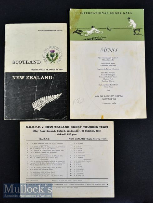 1963-4 NZ All Blacks Rugby Programmes etc (3): Programmes from the tourists’ games against Oxford University (usual Iffley Road card) and Scotland (sl. creased magazine) plus a large interesting illustrated menu card from that day’s International Rugby Gala Dinner at the North British Hotel^ Edinburgh. F/G