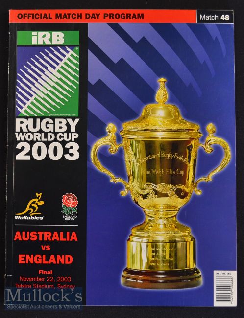 RWC 2003 England Winners v Australia Rugby Programme: The popular and famous edition for the only Northern Hemisphere RWC Champions^ large & heavy^ 130pp in very good condition