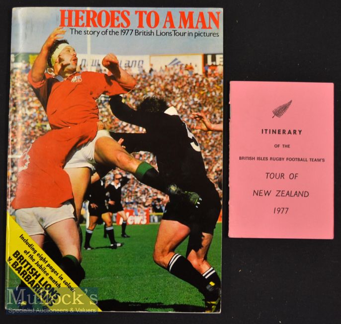 Rare 1977 British & Irish Lions in NZ Rugby Items (2): Not to be found on eBay/Google^ the small intriguing detailed 12pp Lions’ Itinerary of the Tour with all flights^ Coach Journeys^ Players and Hotels; and the post-tour 64pp A4 colourful report-packed brochure ‘Heroes to a Man’ by Terry Godwin & Colin Elsey^ with great pictures. Both VG