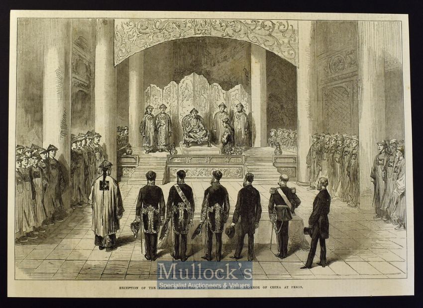 China - The Young Emperor of China, Tung Che Whang-Ti engraved portrait published Sept 1873 20x22cm with audience of the emperor of China Sept 1873 31x22cm both laid to card with information to reverse (2)