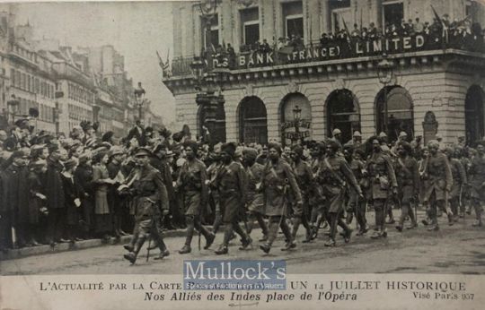 India & Punjab – Victory Parade of Indian Soldiers original antique WWI postcard showing Indian Troops marching in Paris on 14th July 1919 after Victory in Europe in the First World War
