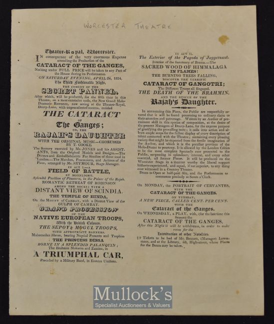 Theatre Royal Worcester Play Bill 1824 date 24th April includes The Cataract of the Ganges, Field of Battle, Sacred Wood of Himmalaga, measures 19x23cm approx. minor creases, disbound