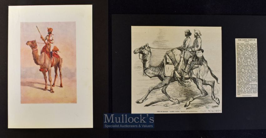 India & Punjab - The Camel Corpin India original engraving from a sketch by an officer of the 92nd Highlander - the Corp was raised in 1858 with about 600 troops and was used in pursuit of the remnants of the Mutiny/rebellion, 16x16cm plus text along with an original illustration of the Bikaneer Gang Risal from A Lovett's Armies of India 22x15cm laid to card (2)