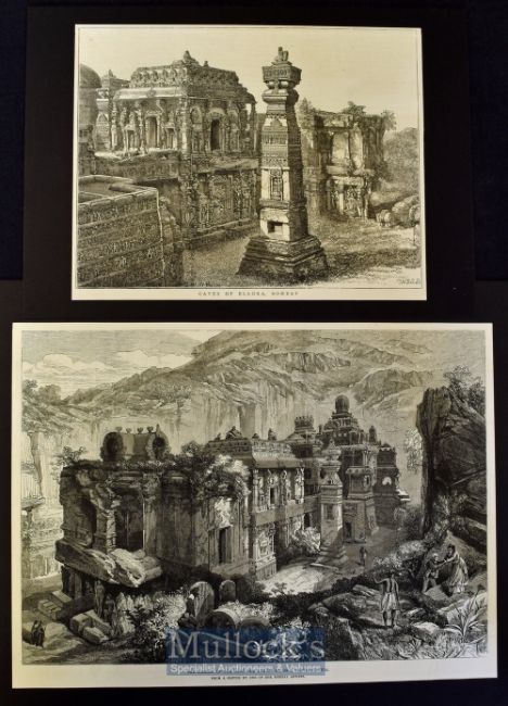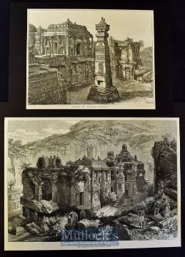India - The Kailas in the Cave Temples of Ellora original Engraving 1876 by William Simpson special artist 32x23cm together with Caves of Ellora Bombay 1875 23x18cm both to card (2)