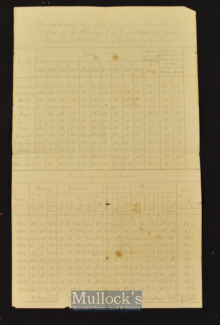 Average Temperatures recorded in manuscript for Valletta Malta 1820s – single sheet, two tables neatly in hand, a detailed record of the average temperature recorded at the hospital for the years 1820-1829. The higher table gives the average temperature per month whilst the lower table divides them into seasons.