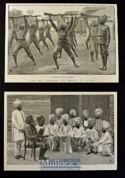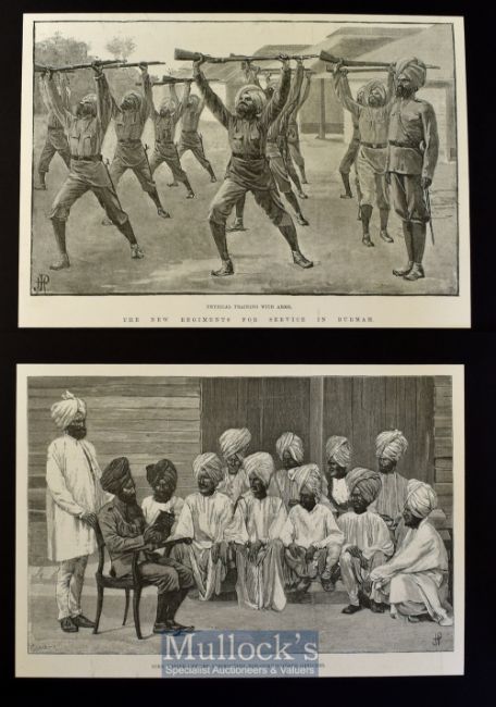 Burma / Sikh - The New Regiments for Service in Burma original engravings Physical Training With Arms (Sikh) and Sikh Native Officer Instructing N.C.O.'s both after drawings by H.P. Jackson published 1891 measures 24x17cm laid to card with information to the reverse (2)
