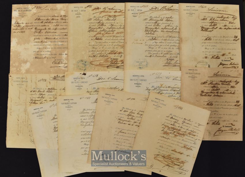 Cuba - Very Rare Group of 12x African slavery Death Certificates - the slaves are noted as having died from such illnesses as "cerebral congestion", cancer, typhoid fever, cirrhosis, tetanus, and other rare illnesses. A rare and interesting selection on medicine and African slavery.