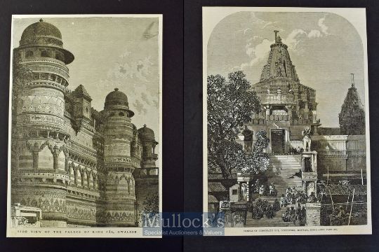 India - Two engravings Temple of Juggonath Rai, Oodeypore Meywar 1868 and Side View of the Palace of King Pal, Gwalior 1875 measures 24x16cm and 25x18cm laid to card (2)