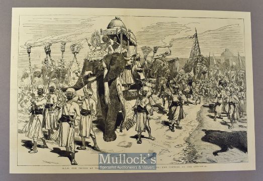 India - Grand Entry into Barroda: The Cortage of the Guicower, The Prince of Wales visit to India Jan 1876 large original engraving from a scarce periodical The Pictorial World 49x33cm laid to card, shows centre fold