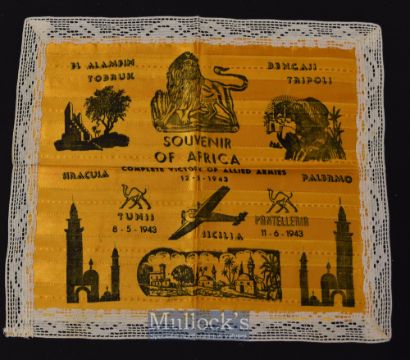 Souvenir Of Africa - Complete Victory Of Allied Armies 12 – 5 – 1943 Pictorial Silk a fine silk with lace borders Souvenir probably printed in Egypt for sale to the British Troops to send home to relatives (Who would never see anything of this quality in the shops in Britain during the 1940s) Size 16½” × 14¼”.