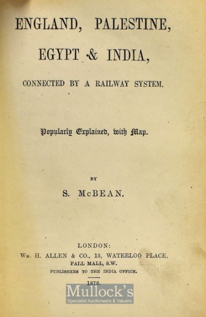 1876 England, Palestine, Egypt & India Connected By A Railway System, Popularly Explained, With Map By S. McBean London: Wm H. Allen & Co. pp. xvi, 143. A rare account. More than half of the map is lacking. Inscribed by the author "To Donald McBean Esq. Inverness with the author's kind love."