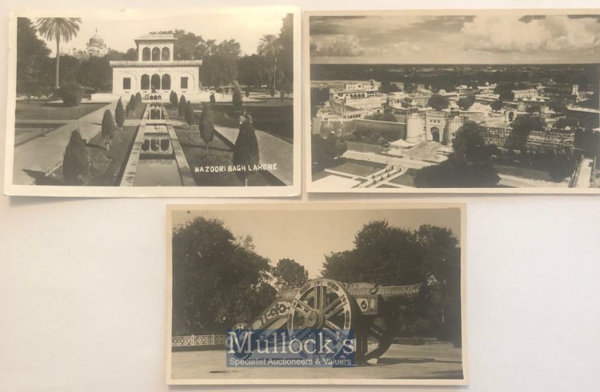 India – Topographical postcards (3) views of the Lahore, Punjab. Including Ranjit Singhs Hazuri Bagh, Zam Zam cannon & bird eye view of city. c1900s