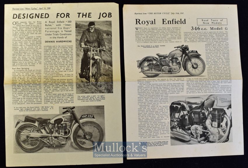 Motoring - Royal Enfield Motor Cycles, 1948 Catalogue A 12 page catalogue illustrating & detailing their range of 2 machines, being 125cc Model RE for £58 and a 346cc Model G for £115. Also photograph of their Works at Redditch. Printed on semi-gloss paper, size 9½” x 7”.