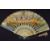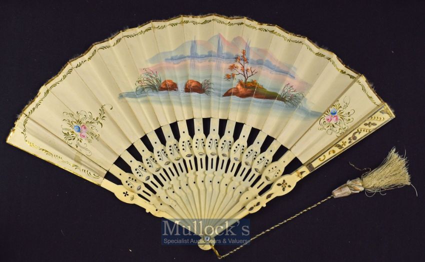 A Beautiful Early European Folding Fan 1820s-40s - With pierced shaped and metal inlaid bone guards and matching sticks with mother of pearl edged rivet and shaped gilt metal loop suspending a tassel, the paper double mount printed and over painted with a scene of figures and a putto, the print signed with a monogram ''EP'' and edged with gilt heightened floral motifs, with painted river scene and floral sprays verso, remnants of a feather edging, guard length. Size 20” × 10¼” (50cm × 26cm).