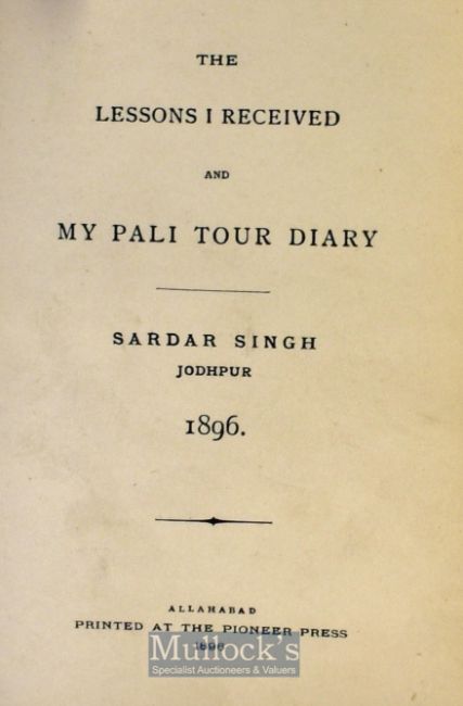 1896 The Lessons I Received And My Pali Tour Diary By Sardar Singh, Jodhpur Allahabad: Printed at the Pioneer Press pp. 194. Sardar Singh [1880-1911] was the Maharaja of Jodhpur who, for a time, was exiled by the British for mismanaging the state. This book was written by him just a year after he came into power.