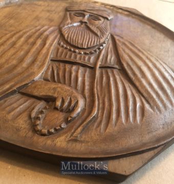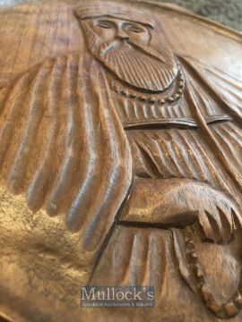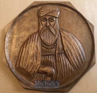 Rare hand carved wooden plaque of the founder of Sikhism, Guru Nanak - Intricately Hand carved from a single piece of wood showing the guru holding praying beads. Wonderful natural patina all over. c1900s Punjab region. Dimension 26 x 25 cm