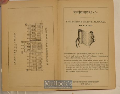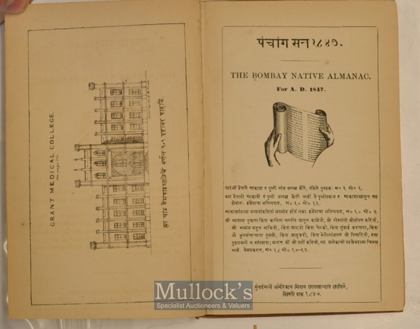 The Bombay Native Almanac for A.D. 1847 Book Printed at the American Mission Press [this line printed in Marathi]. The book has a total of 10 illustrations. The contents are wide-ranging covering Hindu astronomical calculations; Christian, Hindu, Parsi, Muslim and Jewish months, calendars, holidays etc; accounts of Bombay’s benevolent societies; educational institutions; judicial system; list of civil servants in Bombay Presidency; American Mission Chapel etc. It is a presentation copy dated May 1, 1847 from the Bombay Mission to the Theological Institution of Bangor in the US. Hardcover with the bookplate of Bangor Theological Seminary pasted inside front cover which has separated from the book. But no marks, stamps or accession number anywhere and the text block is sound and firm