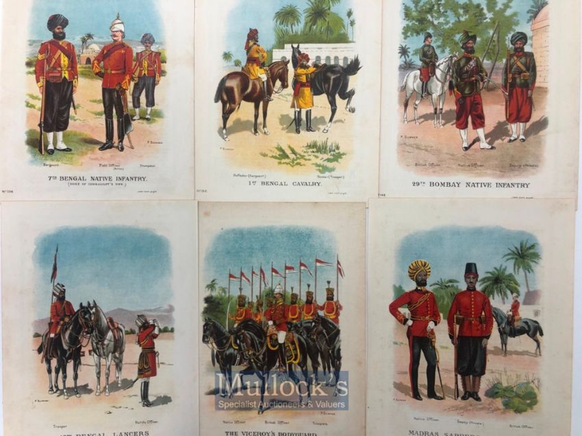 India & Punjab – Sikh Regimental Military chromolithograph Prints a set of six antique prints of various regiments and ranks of the British Indian Army, including 18th Bengal lancers, 1st Bengal Cavalry, 29th Bombay Native Infantry, Madras Sappers & Miners and Viceroys’ Bodyguards (6)