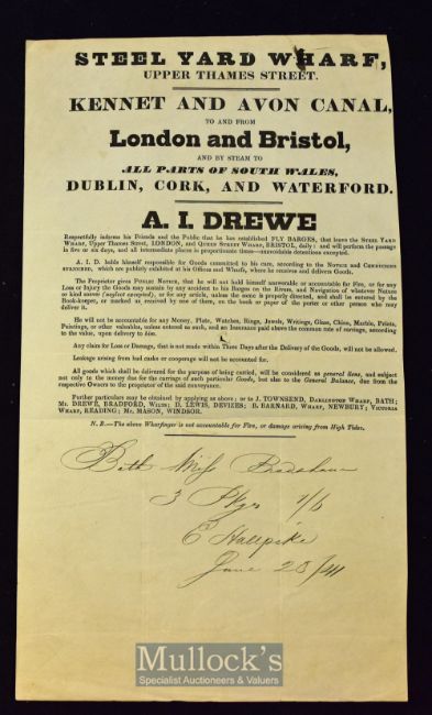 Kennet & Avon Canal 1841 Interesting Handbill giving rules and regulations for conveyance of goods by Fly Boats, and list of Agents along the Canal etc. that had blank space so as to double as a Bill. Manuscript annotations stating 3 packages sent from London to Bath costing 1 shilling and 6 pence. Large format, size 7½” × 13”